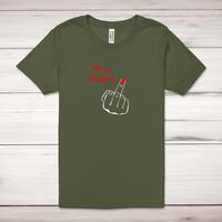 Merry Christmas Middle Finger Adult T-Shirt\nA rude adult t-shirt with "Merry Christmas" and a Middle Finger (select from a man or lady middle finger graphic) printed across the front of a 100% cotton* t-shirt. This rude t-shirt is great as a gift for any occasion.\nAll of our adult t-shirts are designed and hand-printed in the UK and are manufactured from quality 100% pre-shrunk jersey cotton knit for substantial softness and comfort. When quality, durability and substance count, this is the tee everyone can agree on. Featuring a crew neck, short sleeves, twin needle sleeve and bottom hems and unisex sizing. Available in sizes Extra Small to 5XL*.\n\n*Black & White tees available in sizes XS - 5XL, all other colours available XS - 2XL\n\nSize Guide\nUnisex adult t-shirts are measured around the chest, in inches\n\nXS 32/34"\nS 34/36"\nM 38/40"\nL 42/44"\nXL 46/48"\n2XL 50/52"\n3XL 54/56"\n4XL 58/60"5XL 62/64"\n\nSee more on our clothing size guide (opens in new tab)\n\n\nPlease Note\nAll of our t-shirts are hand-printed to order, as a result, colours may vary between prints - images are for illustration purposes only.\n\n