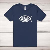 Darwin Christian Fish Adult T-Shirt\nA novelty unisex adult t-shirt with "Darwin Christian Fish" printed across the front of a 100% cotton* t-shirt. This novelty t-shirt is great as a gift for any occasion.\nAll of our adult t-shirts are designed and hand-printed in the UK and are manufactured from quality 100% pre-shrunk jersey cotton knit for substantial softness and comfort. When quality, durability and substance count, this is the tee everyone can agree on. Featuring a crew neck, short sleeves, twin needle sleeve and bottom hems and unisex sizing. Available in sizes Extra Small to 5XL*. *Black & White tees available in sizes XS - 5XL, all other colours available XS - 2XL \n\nSize Guide\nUnisex adult t-shirts are measured across the chest, in inches\n\n \nXS 30/32"\n\nS 34/36"\n\nM 38/40"\n\nL 42/44"\n\nXL 46/48"\n\n2XL 50/52"\n\n3XL 54/56"\n4XL 58/60"5XL 62/64"\n\n\nSee more on our clothing size guide (opens in new tab)\n\n\nPlease Note\nAll of our adult t-shirts are hand-printed to order, as a result, colours may vary between prints - images are for illustration purposes only.\n
