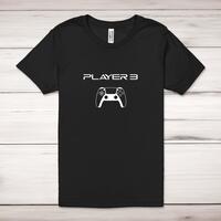 PS Player Adult T-Shirt\nA geeky adult t-shirt with a game controller graphic beneath "Player" and the number of your choice printed across the front of a 100% cotton* t-shirt. This geeky t-shirt is great as a gift for any occasion. Makes a great gift for the PlayStation gamer in your life.\nAll of our adult t-shirts are designed and hand-printed in the UK and are manufactured from quality 100% pre-shrunk jersey cotton knit for substantial softness and comfort. When quality, durability and substance count, this is the tee everyone can agree on. Featuring a crew neck, short sleeves, twin needle sleeve and bottom hems and unisex sizing. Available in sizes Extra Small to 5XL*.\n\n*Black & White tees available in sizes XS - 5XL, all other colours available XS - 2XL\n\nSize Guide\nUnisex adult t-shirts are measured around the chest, in inches\n\nXS 32/34"\nS 34/36"\nM 38/40"\nL 42/44"\nXL 46/48"\n2XL 50/52"\n3XL 54/56"\n4XL 58/60"\n5XL 62/64"\n\nSee more on our clothing size guide (opens in new tab)\n\n\nPlease Note\nAll of our t-shirts are hand-printed to order, as a result, colours may vary between prints - images are for illustration purposes only.\n\n