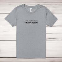 Arse Munching Thundercunt Adult T-Shirt\nA rude adult t-shirt with "Arse Munching Thundercunt" printed across the front of a 100% cotton* t-shirt. This rude t-shirt is great as a gift for any occasion.\nAll of our adult t-shirts are designed and hand-printed in the UK and are manufactured from quality 100% pre-shrunk jersey cotton knit for substantial softness and comfort. When quality, durability and substance count, this is the tee everyone can agree on. Featuring a crew neck, short sleeves, twin needle sleeve and bottom hems and unisex sizing. Available in sizes Extra Small to 5XL*.\n\n*Black & White tees available in sizes XS - 5XL, all other colours available XS - 2XL\n\nSize Guide\nUnisex adult t-shirts are measured around the chest, in inches\n\nXS 32/34"\nS 34/36"\nM 38/40"\nL 42/44"\nXL 46/48"\n2XL 50/52"\n3XL 54/56"\n4XL 58/60"\n5XL 62/64"\n\nSee more on our clothing size guide (opens in new tab)\n\n\nPlease Note\nAll of our t-shirts are hand-printed to order, as a result, colours may vary between prints - images are for illustration purposes only.\n\n