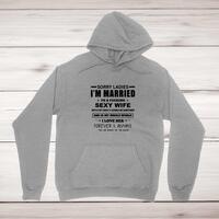 Sorry Ladies Hoodie\nA rude hoodie with "Sorry Ladies I'm Married To A Fucking Sexy Wife She's A Bit Crazy & Scares Me Sometimes She Is My Whole World I Love Her Forever & Always (Yes, She Bought Me This Hoodie)" printed on the front of a unisex pullover hooded sweatshirt. Simple and straight to the point this rude hoodie is great as a\n gift for any occasion.\nComfortable and cosy, this hoodie manages to be both warm and cool. The super soft feel and plush fabric is\n definitely something you’ll want to warm up to. All of our garments are designed and hand-printed in the UK and are\n manufactured from preshrunk fleece knit and features a double-lined hood, and colour-matched drawcord, pouch pocket\n and a tubular body that has been quarter turned to avoid a centre crease; available in sizes small to 5XL.\n\n Classic fit\n Preshrunk fleece knit\n Air jet yarn = softer feel and reduced pilling\n Double-lined hood with colour-matched drawcord\n Pouch pocket\n Twin-needle stitching at shoulder, armhole, neck, waistband and cuffs\n 1 x 1 rib with elastane\n Quarter-turned to eliminate centre crease\n Material Weight 271gsm\n 50% Cotton / 50% Polyester\n\nSize Guide\nmeasured across the chest\n\n S 34/36"\n M 38/40"\n L 42/44"\n XL 46/48"\n 2XL 50/52"\n 3XL 54/56"\n 4XL 58/60"\n 5XL 62/64"\n\nSee more on our clothing size guide (opens in new tab)\n\n Please Note\n All of our items are hand-printed to order, as a result, colours may vary between prints - images are for\n illustration purposes only.\n
