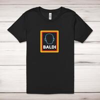 BALDI Adult T-Shirt\nA novelty unisex adult t-shirt with "BALDI" in an Aldi logo inspired graphic printed across the front of a 100% cotton* t-shirt. This novelty t-shirt is great as a gift for any occasion.\nAll of our adult t-shirts are designed and hand-printed in the UK and are manufactured from quality 100% pre-shrunk jersey cotton knit for substantial softness and comfort. When quality, durability and substance count, this is the tee everyone can agree on. Featuring a crew neck, short sleeves, twin needle sleeve and bottom hems and unisex sizing. Available in sizes Extra Small to 5XL*.\n\n*Black & White tees available in sizes XS - 5XL, all other colours available XS - 2XL\n\nSize Guide\nUnisex adult t-shirts are measured around the chest, in inches\n\nXS 32/34"\nS 34/36"\nM 38/40"\nL 42/44"\nXL 46/48"\n2XL 50/52"\n3XL 54/56"\n4XL 58/60"5XL 62/64"\n\nSee more on our clothing size guide (opens in new tab)\n\n\nPlease Note\nAll of our adult t-shirts are hand-printed to order, as a result, colours may vary between prints - images are for illustration purposes only.\n