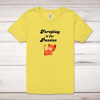 Foreplay Is For Pussies Adult T-Shirt\nA rude unisex adult t-shirt with "Foreplay Is For Pussies" printed across the front of a 100% cotton* t-shirt. This rude t-shirt is great as a gift for any occasion.\nAll of our adult t-shirts are designed and hand-printed in the UK and are manufactured from quality 100% pre-shrunk jersey cotton knit for substantial softness and comfort. When quality, durability and substance count, this is the tee everyone can agree on. Featuring a crew neck, short sleeves, twin needle sleeve and bottom hems and unisex sizing. Available in sizes Extra Small to 5XL*.\n\n*Black & White tees available in sizes XS - 5XL, all other colours available XS - 2XL\n\nSize Guide\nUnisex adult t-shirts are measured around the chest, in inches\n\nXS 32/34"\nS 34/36"\nM 38/40"\nL 42/44"\nXL 46/48"\n2XL 50/52"\n3XL 54/56"\n4XL 58/60"5XL 62/64"\n\nSee more on our clothing size guide (opens in new tab)\n\n\nPlease Note\nAll of our adult t-shirts are hand-printed to order, as a result, colours may vary between prints - images are for illustration purposes only.\n