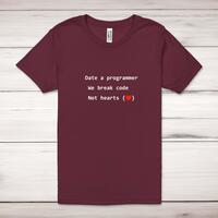 Date A Programmer Adult T-Shirt\nA geeky adult t-shirt with "Date A Programmer We Break Code Not Hearts" printed across the front of a 100% cotton* t-shirt. This geeky t-shirt is great as a gift for any occasion.\nAll of our adult t-shirts are designed and hand-printed in the UK and are manufactured from quality 100% pre-shrunk jersey cotton knit for substantial softness and comfort. When quality, durability and substance count, this is the tee everyone can agree on. Featuring a crew neck, short sleeves, twin needle sleeve and bottom hems and unisex sizing. Available in sizes Extra Small to 5XL*.\n\n*Black & White tees available in sizes XS - 5XL, all other colours available XS - 2XL\n\nSize Guide\nUnisex adult t-shirts are measured around the chest, in inches\n\nXS 32/34"\nS 34/36"\nM 38/40"\nL 42/44"\nXL 46/48"\n2XL 50/52"\n3XL 54/56"\n4XL 58/60"\n5XL 62/64"\n\nSee more on our clothing size guide (opens in new tab)\n\n\nPlease Note\nAll of our t-shirts are hand-printed to order, as a result, colours may vary between prints - images are for illustration purposes only.\n\n