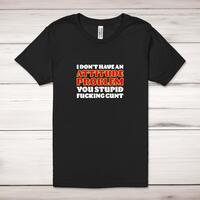 Attitude Problem Adult T-Shirt\nA rude unisex adult t-shirt with "I Don't Have An Attitude Problem You Stupid Fucking Cunt" printed across the front of a 100% cotton* t-shirt. This rude t-shirt is great as a gift for any occasion.\nAll of our adult t-shirts are designed and hand-printed in the UK and are manufactured from quality 100% pre-shrunk jersey cotton knit for substantial softness and comfort. When quality, durability and substance count, this is the tee everyone can agree on. Featuring a crew neck, short sleeves, twin needle sleeve and bottom hems and unisex sizing. Available in sizes Extra Small to 5XL*. *Black & White tees available in sizes XS - 5XL, all other colours available XS - 2XL \n\nSize Guide\nUnisex adult t-shirts are measured across the chest, in inches\n\n \nXS 30/32"\n\nS 34/36"\n\nM 38/40"\n\nL 42/44"\n\nXL 46/48"\n\n2XL 50/52"\n\n3XL 54/56"\n4XL 58/60"5XL 62/64"\n\n\nSee more on our clothing size guide (opens in new tab)\n\n\nPlease Note\nAll of our adult t-shirts are hand-printed to order, as a result, colours may vary between prints - images are for illustration purposes only.\n