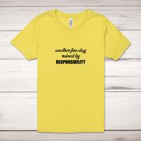 Ruined By Responsibility Adult T-Shirt\nA novelty adult t-shirt with "Another Fine Day Ruined By Responsibility" printed across the front of a 100% cotton* t-shirt. This novelty t-shirt is great as a gift for any occasion.\nAll of our adult t-shirts are designed and hand-printed in the UK and are manufactured from quality 100% pre-shrunk jersey cotton knit for substantial softness and comfort. When quality, durability and substance count, this is the tee everyone can agree on. Featuring a crew neck, short sleeves, twin needle sleeve and bottom hems and unisex sizing. Available in sizes Extra Small to 5XL*.\n\n*Black & White tees available in sizes XS - 5XL, all other colours available XS - 2XL\n\nSize Guide\nUnisex adult t-shirts are measured around the chest, in inches\n\nXS 32/34"\nS 34/36"\nM 38/40"\nL 42/44"\nXL 46/48"\n2XL 50/52"\n3XL 54/56"\n4XL 58/60"\n5XL 62/64"\n\nSee more on our clothing size guide (opens in new tab)\n\n\nPlease Note\nAll of our t-shirts are hand-printed to order, as a result, colours may vary between prints - images are for illustration purposes only.\n\n
