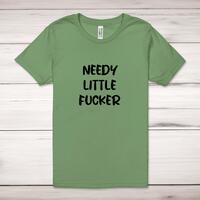Needy Little Fucker Adult T-Shirt\nA rude unisex adult t-shirt with "Needy Little Fucker" printed across the front of a 100% cotton* t-shirt. This rude t-shirt is great as a gift for any occasion.\nAll of our adult t-shirts are designed and hand-printed in the UK and are manufactured from quality 100% pre-shrunk jersey cotton knit for substantial softness and comfort. When quality, durability and substance count, this is the tee everyone can agree on. Featuring a crew neck, short sleeves, twin needle sleeve and bottom hems and unisex sizing. Available in sizes Extra Small to 5XL*.\n\n*Black & White tees available in sizes XS - 5XL, all other colours available XS - 2XL\n\nSize Guide\nUnisex adult t-shirts are measured around the chest, in inches\n\nXS 32/34"\nS 34/36"\nM 38/40"\nL 42/44"\nXL 46/48"\n2XL 50/52"\n3XL 54/56"\n4XL 58/60"5XL 62/64"\n\nSee more on our clothing size guide (opens in new tab)\n\n\nPlease Note\nAll of our adult t-shirts are hand-printed to order, as a result, colours may vary between prints - images are for illustration purposes only.\n