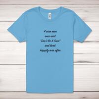A Wise Person Once Said Don't Be A Cunt Adult T-Shirt\nA rude unisex adult t-shirt with "A Wise Man Once Said Don't Be A Cunt and Lived Happily Ever After" printed across the front of a 100% cotton* t-shirt. This rude t-shirt is great as a gift for any occasion.\nAll of our adult t-shirts are designed and hand-printed in the UK and are manufactured from quality 100% pre-shrunk jersey cotton knit for substantial softness and comfort. When quality, durability and substance count, this is the tee everyone can agree on. Featuring a crew neck, short sleeves, twin needle sleeve and bottom hems and unisex sizing. Available in sizes Extra Small to 5XL*. *Black & White tees available in sizes XS - 5XL, all other colours available XS - 2XL \n\nSize Guide\nUnisex adult t-shirts are measured across the chest, in inches\n\n \nXS 30/32"\n\nS 34/36"\n\nM 38/40"\n\nL 42/44"\n\nXL 46/48"\n\n2XL 50/52"\n\n3XL 54/56"\n4XL 58/60"5XL 62/64"\n\n\nSee more on our clothing size guide (opens in new tab)\n\n\nPlease Note\nAll of our adult t-shirts are hand-printed to order, as a result, colours may vary between prints - images are for illustration purposes only.\n