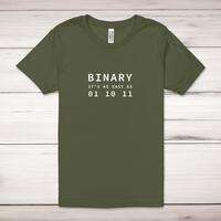 Binary 1 2 3 Adult T-Shirt\nA geeky unisex adult t-shirt with "Binary It's as easy as 01 10 11" printed across the front of a 100% cotton* t-shirt. This geeky t-shirt is great as a gift for any occasion.\nAll of our adult t-shirts are designed and hand-printed in the UK and are manufactured from quality 100% pre-shrunk jersey cotton knit for substantial softness and comfort. When quality, durability and substance count, this is the tee everyone can agree on. Featuring a crew neck, short sleeves, twin needle sleeve and bottom hems and unisex sizing. Available in sizes Extra Small to 5XL*.\n\n*Black & White tees available in sizes XS - 5XL, all other colours available XS - 2XL\n\nSize Guide\nUnisex adult t-shirts are measured around the chest, in inches\n\nXS 32/34"\nS 34/36"\nM 38/40"\nL 42/44"\nXL 46/48"\n2XL 50/52"\n3XL 54/56"\n4XL 58/60"5XL 62/64"\n\nSee more on our clothing size guide (opens in new tab)\n\n\nPlease Note\nAll of our adult t-shirts are hand-printed to order, as a result, colours may vary between prints - images are for illustration purposes only.\n