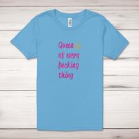 Queen Of Every Fucking Thing Adult T-Shirt\nA rude adult t-shirt with "Queen Of Every Fucking Thing" printed across the front of a 100% cotton* t-shirt. This rude t-shirt is great as a gift for any occasion.\nAll of our adult t-shirts are designed and hand-printed in the UK and are manufactured from quality 100% pre-shrunk jersey cotton knit for substantial softness and comfort. When quality, durability and substance count, this is the tee everyone can agree on. Featuring a crew neck, short sleeves, twin needle sleeve and bottom hems and unisex sizing. Available in sizes Extra Small to 5XL*.\n *Black & White tees available in sizes XS - 5XL, all other colours available XS - 2XL \n\nSize Guide\nUnisex adult t-shirts are measured across the chest, in inches\n\n\nXS 30/32"\n\nS 34/36"\n\nM 38/40"\n\nL 42/44"\n\nXL 46/48"\n\n2XL 50/52"\n\n3XL 54/56"\n4XL 58/60"5XL 62/64"\n\nSee more on our clothing size guide (opens in new tab)\n\n\nPlease Note\nAll of our t-shirts are hand-printed to order, as a result, colours may vary between prints - images are for illustration purposes only.\n\n