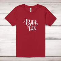 Bitch Tits Adult T-Shirt\nA rude unisex adult t-shirt with "Bitch Tits" printed across the front of a 100% cotton* t-shirt. This rude t-shirt is great as a gift for any occasion.\nAll of our adult t-shirts are designed and hand-printed in the UK and are manufactured from quality 100% pre-shrunk jersey cotton knit for substantial softness and comfort. When quality, durability and substance count, this is the tee everyone can agree on. Featuring a crew neck, short sleeves, twin needle sleeve and bottom hems and unisex sizing. Available in sizes Extra Small to 5XL*. *Black & White tees available in sizes XS - 5XL, all other colours available XS - 2XL \n\nSize Guide\nUnisex adult t-shirts are measured across the chest, in inches\n\n \nXS 30/32"\n\nS 34/36"\n\nM 38/40"\n\nL 42/44"\n\nXL 46/48"\n\n2XL 50/52"\n\n3XL 54/56"\n4XL 58/60"5XL 62/64"\n\n\nSee more on our clothing size guide (opens in new tab)\n\n\nPlease Note\nAll of our adult t-shirts are hand-printed to order, as a result, colours may vary between prints - images are for illustration purposes only.\n