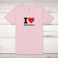 I Love Redundancy Adult T-Shirt\nA novelty unisex adult t-shirt with "I Love Redundancy" printed across the front of a 100% cotton* t-shirt. This novelty t-shirt is great as a gift for any occasion.\nAll of our adult t-shirts are designed and hand-printed in the UK and are manufactured from quality 100% pre-shrunk jersey cotton knit for substantial softness and comfort. When quality, durability and substance count, this is the tee everyone can agree on. Featuring a crew neck, short sleeves, twin needle sleeve and bottom hems and unisex sizing. Available in sizes Extra Small to 5XL*.\n\n*Black & White tees available in sizes XS - 5XL, all other colours available XS - 2XL\n\nSize Guide\nUnisex adult t-shirts are measured around the chest, in inches\n\nXS 32/34"\nS 34/36"\nM 38/40"\nL 42/44"\nXL 46/48"\n2XL 50/52"\n3XL 54/56"\n4XL 58/60"5XL 62/64"\n\nSee more on our clothing size guide (opens in new tab)\n\n\nPlease Note\nAll of our adult t-shirts are hand-printed to order, as a result, colours may vary between prints - images are for illustration purposes only.\n