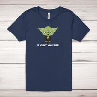 A Cunt You Are Adult T-Shirt\nA rude adult t-shirt with a cute Yoda graphic and the phrase A Cunt You Are (let us know in the order notes if you would like a different swearword) printed across the front of a 100% cotton* t-shirt. This rude t-shirt is great as a gift for any occasion.\nAll of our adult t-shirts are designed and hand-printed in the UK and are manufactured from quality 100% pre-shrunk jersey cotton knit for substantial softness and comfort. When quality, durability and substance count, this is the tee everyone can agree on. Featuring a crew neck, short sleeves, twin needle sleeve and bottom hems and unisex sizing. Available in sizes Extra Small to 5XL*.\n\n*Black & White tees available in sizes XS - 5XL, all other colours available XS - 2XL\n\nSize Guide\nUnisex adult t-shirts are measured around the chest, in inches\n\nXS 32/34"\nS 34/36"\nM 38/40"\nL 42/44"\nXL 46/48"\n2XL 50/52"\n3XL 54/56"\n4XL 58/60"5XL 62/64"\n\nSee more on our clothing size guide (opens in new tab)\n\n\nPlease Note\nAll of our t-shirts are hand-printed to order, as a result, colours may vary between prints - images are for illustration purposes only.\n\n