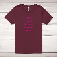 Negative Bullshit Adult T-Shirt\nA rude adult t-shirt with "I Have No Time For Your Negative Bullshit" printed across the front of a 100% cotton* t-shirt. This rude t-shirt is great as a gift for any occasion.\nAll of our adult t-shirts are designed and hand-printed in the UK and are manufactured from quality 100% pre-shrunk jersey cotton knit for substantial softness and comfort. When quality, durability and substance count, this is the tee everyone can agree on. Featuring a crew neck, short sleeves, twin needle sleeve and bottom hems and unisex sizing. Available in sizes Extra Small to 5XL*.\n *Black & White tees available in sizes XS - 5XL, all other colours available XS - 2XL \n\nSize Guide\nUnisex adult t-shirts are measured across the chest, in inches\n\n\nXS 30/32"\n\nS 34/36"\n\nM 38/40"\n\nL 42/44"\n\nXL 46/48"\n\n2XL 50/52"\n\n3XL 54/56"\n4XL 58/60"5XL 62/64"\n\nSee more on our clothing size guide (opens in new tab)\n\n\nPlease Note\nAll of our t-shirts are hand-printed to order, as a result, colours may vary between prints - images are for illustration purposes only.\n\n