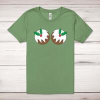 Christmas Pud Boobs Adult T-Shirt\nA novelty adult t-shirt with a fantastic pair of Christmas puddings printed across the front of a 100% cotton* t-shirt. This novelty t-shirt is great as a gift for any occasion.\nAll of our adult t-shirts are designed and hand-printed in the UK and are manufactured from quality 100% pre-shrunk jersey cotton knit for substantial softness and comfort. When quality, durability and substance count, this is the tee everyone can agree on. Featuring a crew neck, short sleeves, twin needle sleeve and bottom hems and unisex sizing. Available in sizes Extra Small to 5XL*.\n *Black & White tees available in sizes XS - 5XL, all other colours available XS - 2XL \n\nSize Guide\nUnisex adult t-shirts are measured across the chest, in inches\n\nXS 30/32"\nS 34/36"\nM 38/40"\nL 42/44"\nXL 46/48"\n2XL 50/52"\n3XL 54/56"\n4XL 58/60"5XL 62/64"\n\nSee more on our clothing size guide (opens in new tab)\n\n\nPlease Note\nAll of our t-shirts are hand-printed to order, as a result, colours may vary between prints - images are for illustration purposes only.\n\n