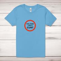 You Park Like A Cunt Adult T-Shirt\nA rude adult t-shirt with "You Park Like A Cunt" printed across the front of a 100% cotton* t-shirt. This rude t-shirt is great as a gift for any occasion.\nAll of our adult t-shirts are designed and hand-printed in the UK and are manufactured from quality 100% pre-shrunk jersey cotton knit for substantial softness and comfort. When quality, durability and substance count, this is the tee everyone can agree on. Featuring a crew neck, short sleeves, twin needle sleeve and bottom hems and unisex sizing. Available in sizes Extra Small to 5XL*.\n\n*Black & White tees available in sizes XS - 5XL, all other colours available XS - 2XL\n\nSize Guide\nUnisex adult t-shirts are measured around the chest, in inches\n\nXS 32/34"\nS 34/36"\nM 38/40"\nL 42/44"\nXL 46/48"\n2XL 50/52"\n3XL 54/56"\n4XL 58/60"5XL 62/64"\n\nSee more on our clothing size guide (opens in new tab)\n\n\nPlease Note\nAll of our t-shirts are hand-printed to order, as a result, colours may vary between prints - images are for illustration purposes only.\n\n