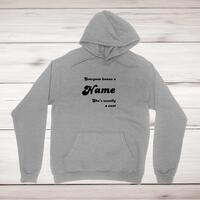 Everyone Knows A Name He's She's Usually A Cunt Hoodie\nA rude hoodie with "Everyone Knows A Name He's/She's Usually A Cunt" printed on the front of a unisex pullover hooded sweatshirt. Simple and straight to the point this rude hoodie is great as a\n gift for any occasion.\nComfortable and cosy, this hoodie manages to be both warm and cool. The super soft feel and plush fabric is\n definitely something you’ll want to warm up to. All of our garments are designed and hand-printed in the UK and are\n manufactured from preshrunk fleece knit and features a double-lined hood, and colour-matched drawcord, pouch pocket\n and a tubular body that has been quarter turned to avoid a centre crease; available in sizes small to 5XL.\n\n Classic fit\n Preshrunk fleece knit\n Air jet yarn = softer feel and reduced pilling\n Double-lined hood with colour-matched drawcord\n Pouch pocket\n Twin-needle stitching at shoulder, armhole, neck, waistband and cuffs\n 1 x 1 rib with elastane\n Quarter-turned to eliminate centre crease\n Material Weight 271gsm\n 50% Cotton / 50% Polyester\n\nSize Guide\nmeasured across the chest\n\n \n S 34/36"\n \n M 38/40"\n \n L 42/44"\n \n XL 46/48"\n \n 2XL 50/52"\n \n 3XL 54/56"\n \n 4XL 58/60"\n \n 5XL 62/64"\n\nSee more on our clothing size guide (opens in new tab)\n\n Please Note\n All of our items are hand-printed to order, as a result, colours may vary between prints - images are for\n illustration purposes only.\n