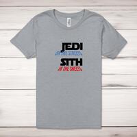Jedi On the Streets Adult T-Shirt\nA geeky unisex adult t-shirt with "Jedi On the Streets Sith In The Sheets" printed across the front of a 100% cotton* t-shirt. This geeky t-shirt is great as a gift for any occasion.\nAll of our adult t-shirts are designed and hand-printed in the UK and are manufactured from quality 100% pre-shrunk jersey cotton knit for substantial softness and comfort. When quality, durability and substance count, this is the tee everyone can agree on. Featuring a crew neck, short sleeves, twin needle sleeve and bottom hems and unisex sizing. Available in sizes Extra Small to 5XL*.\n\n*Black & White tees available in sizes XS - 5XL, all other colours available XS - 2XL\n\nSize Guide\nUnisex adult t-shirts are measured around the chest, in inches\n\nXS 32/34"\nS 34/36"\nM 38/40"\nL 42/44"\nXL 46/48"\n2XL 50/52"\n3XL 54/56"\n4XL 58/60"5XL 62/64"\n\nSee more on our clothing size guide (opens in new tab)\n\n\nPlease Note\nAll of our adult t-shirts are hand-printed to order, as a result, colours may vary between prints - images are for illustration purposes only.\n