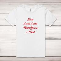 Your Secret Santa Adult T-ShirtA rude unisex adult t-shirt with 'Your Secret Santa Thinks You're A Cunt' printed across the front of a 100% cotton* t-shirt. This rude t-shirt is great as a gift for any occasion.All of our unisex adult t-shirts are designed and hand-printed in the UK and are manufactured from 100% ringspun cotton for a premium quality feel and feature double-stitched waist hem and sleeves, seamless double-needle collar, taped neck and shoulders, and a tubular body that has been quarter turned to avoid a centre crease; available in sizes from Extra Small to 4XL*. *Black & White tees available in sizes XS - 4XL, all other colours available XS - 2XL Size GuideUnisex adult t-shirts are measured across the chest, in inchesXS 30/32'S 34/36'M 38/40'L 42/44'XL 46/48'2XL 50/52'3XL 54/56'4XL 58/60'See more on our clothing size guide (opens in new tab)Please NoteAll of our items are hand-printed to order, as a result, colours may vary between prints - images are for illustration purposes only.Show more products with the Your Secret Santa design