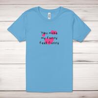You Make My Fanny Feel Funny Adult T-ShirtA rude unisex adult t-shirt with 'You Make My Fanny Feel Funny' printed across the front of a 100% cotton* t-shirt. This rude t-shirt is great as a gift for any occasion.All of our unisex adult t-shirts are designed and hand-printed in the UK and are manufactured from 100% ringspun cotton for a premium quality feel and feature double-stitched waist hem and sleeves, seamless double-needle collar, taped neck and shoulders, and a tubular body that has been quarter turned to avoid a centre crease; available in sizes from Extra Small to 4XL*. *Black & White tees available in sizes XS - 4XL, all other colours available XS - 2XL Size GuideUnisex adult t-shirts are measured across the chest, in inchesXS 30/32'S 34/36'M 38/40'L 42/44'XL 46/48'2XL 50/52'3XL 54/56'4XL 58/60'See more on our clothing size guide (opens in new tab)Please NoteAll of our items are hand-printed to order, as a result, colours may vary between prints - images are for illustration purposes only.Show more products with the You Make My design