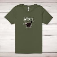 Lesbians Eat What Adult T-ShirtA rude unisex adult t-shirt with 'Lesbians Eat What?!' printed across the front of a 100% cotton* t-shirt. This rude t-shirt is great as a gift for any occasion.All of our unisex adult t-shirts are designed and hand-printed in the UK and are manufactured from 100% ringspun cotton for a premium quality feel and feature double-stitched waist hem and sleeves, seamless double-needle collar, taped neck and shoulders, and a tubular body that has been quarter turned to avoid a centre crease; available in sizes from Extra Small to 4XL*. *Black & White tees available in sizes XS - 4XL, all other colours available XS - 2XL Size GuideUnisex adult t-shirts are measured across the chest, in inchesXS 30/32'S 34/36'M 38/40'L 42/44'XL 46/48'2XL 50/52'3XL 54/56'4XL 58/60'See more on our clothing size guide (opens in new tab)Please NoteAll of our items are hand-printed to order, as a result, colours may vary between prints - images are for illustration purposes only.Show more products with the Lesbians Eat What design