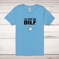 I'm With The Dilf Adult T-ShirtA rude unisex adult t-shirt with 'I'm With The Dilf' printed across the front of a 100% cotton* t-shirt. This rude t-shirt is great as a gift for any occasion.All of our unisex adult t-shirts are designed and hand-printed in the UK and are manufactured from 100% ringspun cotton for a premium quality feel and feature double-stitched waist hem and sleeves, seamless double-needle collar, taped neck and shoulders, and a tubular body that has been quarter turned to avoid a centre crease; available in sizes from Extra Small to 4XL*. *Black & White tees available in sizes XS - 4XL, all other colours available XS - 2XL Size GuideUnisex adult t-shirts are measured across the chest, in inchesXS 30/32'S 34/36'M 38/40'L 42/44'XL 46/48'2XL 50/52'3XL 54/56'4XL 58/60'See more on our clothing size guide (opens in new tab)Please NoteAll of our items are hand-printed to order, as a result, colours may vary between prints - images are for illustration purposes only.Show more products with the I'm With The... design
