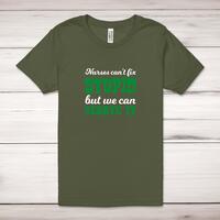 Nurses Can't Fix Stupid Adult T-Shirt\nA novelty unisex adult t-shirt with "Nurses Can't Fix Stupid" printed across the front of a 100% cotton* t-shirt. This novelty t-shirt is great as a gift for any occasion.\nAll of our adult t-shirts are designed and hand-printed in the UK and are manufactured from quality 100% pre-shrunk jersey cotton knit for substantial softness and comfort. When quality, durability and substance count, this is the tee everyone can agree on. Featuring a crew neck, short sleeves, twin needle sleeve and bottom hems and unisex sizing. Available in sizes Extra Small to 5XL*. *Black & White tees available in sizes XS - 5XL, all other colours available XS - 2XL \n\nSize Guide\nUnisex adult t-shirts are measured across the chest, in inches\n\n \nXS 30/32"\n\nS 34/36"\n\nM 38/40"\n\nL 42/44"\n\nXL 46/48"\n\n2XL 50/52"\n\n3XL 54/56"\n4XL 58/60"5XL 62/64"\n\n\nSee more on our clothing size guide (opens in new tab)\n\n\nPlease Note\nAll of our adult t-shirts are hand-printed to order, as a result, colours may vary between prints - images are for illustration purposes only.\n