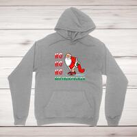 Ho Ho Ho Motherfucker Santa Hoodie\nA rude hoodie with a colourful graphic of Santa crapping in his hat and "Ho Ho Ho Motherfucker" printed on the front of a unisex pullover hooded sweatshirt. Simple and straight to the point this rude hoodie is great as a\n gift for any occasion.\nComfortable and cosy, this hoodie manages to be both warm and cool. The super soft feel and plush fabric is\n definitely something you’ll want to warm up to. All of our garments are designed and hand-printed in the UK and are\n manufactured from preshrunk fleece knit and features a double-lined hood, and colour-matched drawcord, pouch pocket\n and a tubular body that has been quarter turned to avoid a centre crease; available in sizes small to 5XL.\n\n Classic fit\n Preshrunk fleece knit\n Air jet yarn = softer feel and reduced pilling\n Double-lined hood with colour-matched drawcord\n Pouch pocket\n Twin-needle stitching at shoulder, armhole, neck, waistband and cuffs\n 1 x 1 rib with elastane\n Quarter-turned to eliminate centre crease\n Material Weight 271gsm\n 50% Cotton / 50% Polyester\n\nSize Guide\nmeasured across the chest\n\n S 34/36"\n M 38/40"\n L 42/44"\n XL 46/48"\n 2XL 50/52"\n 3XL 54/56"\n 4XL 58/60"\n 5XL 62/64"\n\nSee more on our clothing size guide (opens in new tab)\n\n Please Note\n All of our items are hand-printed to order, as a result, colours may vary between prints - images are for\n illustration purposes only.\n