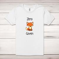 Zero Fox Given Adult T-Shirt\nA rude adult t-shirt with "Zero Fox Given" printed across the front of a 100% cotton* t-shirt. This rude t-shirt is great as a gift for any occasion.\nAll of our adult t-shirts are designed and hand-printed in the UK and are manufactured from quality 100% pre-shrunk jersey cotton knit for substantial softness and comfort. When quality, durability and substance count, this is the tee everyone can agree on. Featuring a crew neck, short sleeves, twin needle sleeve and bottom hems and unisex sizing. Available in sizes Extra Small to 5XL*.\n\n*Black & White tees available in sizes XS - 5XL, all other colours available XS - 2XL\n\nSize Guide\nUnisex adult t-shirts are measured around the chest, in inches\n\nXS 32/34"\nS 34/36"\nM 38/40"\nL 42/44"\nXL 46/48"\n2XL 50/52"\n3XL 54/56"\n4XL 58/60"\n5XL 62/64"\n\nSee more on our clothing size guide (opens in new tab)\n\n\nPlease Note\nAll of our t-shirts are hand-printed to order, as a result, colours may vary between prints - images are for illustration purposes only.\n\n