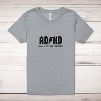 ADHD Adult T-Shirt\nA rude adult t-shirt with "ADHD Highway To Hey Look A Squirrel!" printed across the front of a 100% cotton* t-shirt. This rude t-shirt is great as a gift for any occasion.\nAll of our adult t-shirts are designed and hand-printed in the UK and are manufactured from quality 100% pre-shrunk jersey cotton knit for substantial softness and comfort. When quality, durability and substance count, this is the tee everyone can agree on. Featuring a crew neck, short sleeves, twin needle sleeve and bottom hems and unisex sizing. Available in sizes Extra Small to 5XL*.\n\n*Black & White tees available in sizes XS - 5XL, all other colours available XS - 2XL\n\nSize Guide\nUnisex adult t-shirts are measured around the chest, in inches\n\nXS 32/34"\nS 34/36"\nM 38/40"\nL 42/44"\nXL 46/48"\n2XL 50/52"\n3XL 54/56"\n4XL 58/60"\n5XL 62/64"\n\nSee more on our clothing size guide (opens in new tab)\n\n\nPlease Note\nAll of our t-shirts are hand-printed to order, as a result, colours may vary between prints - images are for illustration purposes only.\n\n