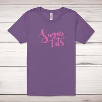 Sugar Tits Adult T-Shirt\nA rude adult t-shirt with "Sugar Tits" printed across the front of a 100% cotton* t-shirt. This rude t-shirt is great as a gift for any occasion.\nAll of our adult t-shirts are designed and hand-printed in the UK and are manufactured from quality 100% pre-shrunk jersey cotton knit for substantial softness and comfort. When quality, durability and substance count, this is the tee everyone can agree on. Featuring a crew neck, short sleeves, twin needle sleeve and bottom hems and unisex sizing. Available in sizes Extra Small to 5XL*.\n *Black & White tees available in sizes XS - 5XL, all other colours available XS - 2XL \n\nSize Guide\nUnisex adult t-shirts are measured across the chest, in inches\n\n\nXS 30/32"\n\nS 34/36"\n\nM 38/40"\n\nL 42/44"\n\nXL 46/48"\n\n2XL 50/52"\n\n3XL 54/56"\n4XL 58/60"5XL 62/64"\n\nSee more on our clothing size guide (opens in new tab)\n\n\nPlease Note\nAll of our t-shirts are hand-printed to order, as a result, colours may vary between prints - images are for illustration purposes only.\n\n
