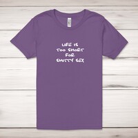 Shitty Sex Adult T-Shirt\nA rude adult t-shirt with "Life Is Too Short For Shitty Sex" printed across the front of a 100% cotton* unisex t-shirt. This rude t-shirt is great as a gift for any occasion.\nAll of our adult t-shirts are designed and hand-printed in the UK and are manufactured from quality 100% pre-shrunk jersey cotton knit for substantial softness and comfort. When quality, durability and substance count, this is the tee everyone can agree on. Featuring a crew neck, short sleeves, twin needle sleeve and bottom hems and unisex sizing. Available in sizes Extra Small to 5XL*.\n\n*Black & White tees available in sizes XS - 5XL, all other colours available XS - 2XL\n\nSize Guide\nUnisex adult t-shirts are measured around the chest, in inches\n\nXS 32/34"\nS 34/36"\nM 38/40"\nL 42/44"\nXL 46/48"\n2XL 50/52"\n3XL 54/56"\n4XL 58/60"\n5XL 62/64"\n\nSee more on our clothing size guide (opens in new tab)\n\n\nPlease Note\nAll of our adult t-shirts are hand-printed to order, as a result, colours may vary between prints - images are for illustration purposes only.\n