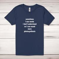 Sometimes I Use Words Adult T-Shirt\nA novelty unisex adult t-shirt with "sometimesI use words I don't understand so I can sound more photosynthesis" printed across the front of a 100% cotton* t-shirt. This novelty t-shirt is great as a gift for any occasion.\nAll of our adult t-shirts are designed and hand-printed in the UK and are manufactured from quality 100% pre-shrunk jersey cotton knit for substantial softness and comfort. When quality, durability and substance count, this is the tee everyone can agree on. Featuring a crew neck, short sleeves, twin needle sleeve and bottom hems and unisex sizing. Available in sizes Extra Small to 5XL*.\n\n*Black & White tees available in sizes XS - 5XL, all other colours available XS - 2XL\n\nSize Guide\nUnisex adult t-shirts are measured around the chest, in inches\n\nXS 32/34"\nS 34/36"\nM 38/40"\nL 42/44"\nXL 46/48"\n2XL 50/52"\n3XL 54/56"\n4XL 58/60"5XL 62/64"\n\nSee more on our clothing size guide (opens in new tab)\n\n\nPlease Note\nAll of our adult t-shirts are hand-printed to order, as a result, colours may vary between prints - images are for illustration purposes only.\n
