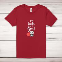 Your Hole Is Still My Goal Adult T-Shirt\nA rude unisex adult t-shirt with "Your Hole Is Still My Goal" printed across the front of a 100% cotton* t-shirt. This rude t-shirt is great as a gift for any occasion.\nAll of our adult t-shirts are designed and hand-printed in the UK and are manufactured from quality 100% pre-shrunk jersey cotton knit for substantial softness and comfort. When quality, durability and substance count, this is the tee everyone can agree on. Featuring a crew neck, short sleeves, twin needle sleeve and bottom hems and unisex sizing. Available in sizes Extra Small to 5XL*.\n\n*Black & White tees available in sizes XS - 5XL, all other colours available XS - 2XL\n\nSize Guide\nUnisex adult t-shirts are measured around the chest, in inches\n\nXS 32/34"\nS 34/36"\nM 38/40"\nL 42/44"\nXL 46/48"\n2XL 50/52"\n3XL 54/56"\n4XL 58/60"5XL 62/64"\n\nSee more on our clothing size guide (opens in new tab)\n\n\nPlease Note\nAll of our adult t-shirts are hand-printed to order, as a result, colours may vary between prints - images are for illustration purposes only.\n