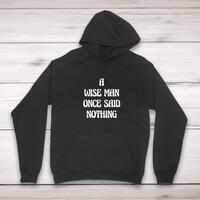 A Wise Man Hoodie\nA novelty hoodie with "A Wise Man Once Said Nothing" printed on the front of a unisex pullover hooded sweatshirt. Simple and straight to the point this novelty hoodie is great as a\n gift for any occasion.\nComfortable and cosy, this hoodie manages to be both warm and cool. The super soft feel and plush fabric is\n definitely something you’ll want to warm up to. All of our garments are designed and hand-printed in the UK and are\n manufactured from preshrunk fleece knit and features a double-lined hood, and colour-matched drawcord, pouch pocket\n and a tubular body that has been quarter turned to avoid a centre crease; available in sizes small to 5XL.\n\n Classic fit\n Preshrunk fleece knit\n Air jet yarn = softer feel and reduced pilling\n Double-lined hood with colour-matched drawcord\n Pouch pocket\n Twin-needle stitching at shoulder, armhole, neck, waistband and cuffs\n 1 x 1 rib with elastane\n Quarter-turned to eliminate centre crease\n Material Weight 271gsm\n 50% Cotton / 50% Polyester\n\nSize Guide\nmeasured across the chest\n\n S 34/36"\n M 38/40"\n L 42/44"\n XL 46/48"\n 2XL 50/52"\n 3XL 54/56"\n 4XL 58/60"\n 5XL 62/64"\n\nSee more on our clothing size guide (opens in new tab)\n\n Please Note\n All of our items are hand-printed to order, as a result, colours may vary between prints - images are for\n illustration purposes only.\n