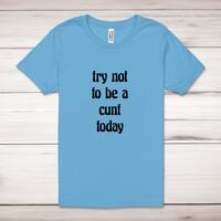 Try Not To Be Adult T-Shirt\nA rude unisex adult t-shirt with "Try Not To Be A Cunt Today" printed across the front of a 100% cotton* t-shirt. This rude t-shirt is great as a gift for any occasion.\nAll of our adult t-shirts are designed and hand-printed in the UK and are manufactured from quality 100% pre-shrunk jersey cotton knit for substantial softness and comfort. When quality, durability and substance count, this is the tee everyone can agree on. Featuring a crew neck, short sleeves, twin needle sleeve and bottom hems and unisex sizing. Available in sizes Extra Small to 5XL*.\n\n*Black & White tees available in sizes XS - 5XL, all other colours available XS - 2XL\n\nSize Guide\nUnisex adult t-shirts are measured around the chest, in inches\n\nXS 32/34"\nS 34/36"\nM 38/40"\nL 42/44"\nXL 46/48"\n2XL 50/52"\n3XL 54/56"\n4XL 58/60"5XL 62/64"\n\nSee more on our clothing size guide (opens in new tab)\n\n\nPlease Note\nAll of our adult t-shirts are hand-printed to order, as a result, colours may vary between prints - images are for illustration purposes only.\n