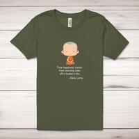 True Happiness Adult T-Shirt\nA rude adult t-shirt with a colourful Buddhist monk graphic and the quote "True happiness comes from snorting coke off a hooker’s tits." attributed to the Dalai Lama printed across the front of a 100% cotton* t-shirt. This rude t-shirt is great as a gift for any occasion.\nAll of our adult t-shirts are designed and hand-printed in the UK and are manufactured from quality 100% pre-shrunk jersey cotton knit for substantial softness and comfort. When quality, durability and substance count, this is the tee everyone can agree on. Featuring a crew neck, short sleeves, twin needle sleeve and bottom hems and unisex sizing. Available in sizes Extra Small to 5XL*. *Black & White tees available in sizes XS - 5XL, all other colours available XS - 2XL \n\nSize Guide\nUnisex adult t-shirts are measured across the chest, in inches\n\n \nXS 30/32"\n\nS 34/36"\n\nM 38/40"\n\nL 42/44"\n\nXL 46/48"\n\n2XL 50/52"\n\n3XL 54/56"\n4XL 58/60"5XL 62/64"\n\n\nSee more on our clothing size guide (opens in new tab)\n\n\nPlease Note\nAll of our adult t-shirts are hand-printed to order, as a result, colours may vary between prints - images are for illustration purposes only.\n