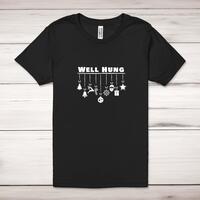 Well Hung Adult T-Shirt\nA novelty adult t-shirt with "Well Hung" and a dazzling display of Christmas decorations printed across the front of a 100% cotton* t-shirt. This novelty t-shirt is great as a gift for any occasion.\nAll of our adult t-shirts are designed and hand-printed in the UK and are manufactured from quality 100% pre-shrunk jersey cotton knit for substantial softness and comfort. When quality, durability and substance count, this is the tee everyone can agree on. Featuring a crew neck, short sleeves, twin needle sleeve and bottom hems and unisex sizing. Available in sizes Extra Small to 5XL*.\n *Black & White tees available in sizes XS - 5XL, all other colours available XS - 2XL \n\nSize Guide\nUnisex adult t-shirts are measured across the chest, in inches\n\nXS 30/32"\nS 34/36"\nM 38/40"\nL 42/44"\nXL 46/48"\n2XL 50/52"\n3XL 54/56"\n4XL 58/60"\n5XL 62/64"\n\nSee more on our clothing size guide (opens in new tab)\n\n\nPlease Note\nAll of our t-shirts are hand-printed to order, as a result, colours may vary between prints - images are for illustration purposes only.\n\n