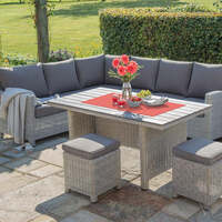 Because of its vast dimensions, the Kettler Palma Corner Right Hand White Wash Wicker Outdoor Sofa Set with Slat Top Table is perfect for the garden. This outdoor furniture set, which seats up to 8 people, is a perfect combination of outdoor dining and lounging. It looks fantastic, is functional, and quite comfy. The set features an L-shaped outdoor corner sofa, two stools, and an outdoor dining table made of Polywood with a recycled plastic slatted top. Because it is UV and weather resistant, the handwoven synthetic weave can be left outside all year. The strong, rust-proof aluminium frame is reinforced throughout the sofa pieces to guarantee the structure remains stable even after extended use. The cushions on the sofa are soft, with a 5cm foam core in the seat cushions and double piping in the back cushions. Although they are stain and shower resistant, they should be left outside when not in use. The Kettler Palma outdoor furniture collection's sturdy aluminium frame is wrapped in weatherproof wicker. It comes in two colours: White Wash or Oyster. Kettler's Casual Dining concept combines exquisite outdoor dining with relaxation in the sun. Set Features Set includes 2x 3-seater sofas and 2x stools and durable polywood topped Palma Table Material: Aluminium square tube frame with 5mm half round wicker Weatherproof, UV resistant wicker – leave outdoors all year round (except cushions) Durable and long-lasting – built to the highest specification with extra supports along sofa 5cm foam core seat cushions and double piped back cushions for additional support (stain and shower resistant – we advise taking cushions indoors when not in use) Seats 8 people (approx.) 3-year warranty Colour: White Wash Set Dimensions Corner Sofa: 85cm (H) x 208.5cm (W) x 80cm (D) 3-Seater Sofa: 85 (H) x 178 (W) x 80cm (D) Sofa's Seat Height: 48cm Sofa's Arm Height: 64cm Stool(s): 48cm (H) x 38cm (W) x 38cm (D) Stools' Seat Height: 48cm Table: 68.5cm (H) x 148cm (W) x 78.5cm (D)