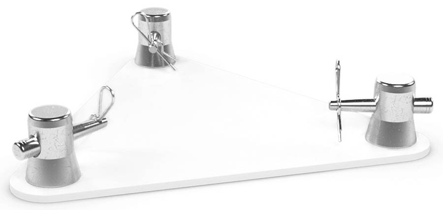 Aluminium Base for PT290 Truss. Available in Aluminium- Black or White Finish. Supplied with ConnectorsDimensions: 290 x 290 x 5mm Weight: 2.85Kg. A triangular truss baseplate designed for a Trio290mm truss system supplied in a black- aluminium or white finish and certified by ISO DIN 4113 and TšV. The conical connectors and pins allow for quick and easy setup- while also ensuring a safe- stable installation. Additionally- disassembling the truss system is also quick and easy with these connectors. The baseplate comes with 3 conical half-sleeves- 3 spigot pins- and 3 safety pins to secure the truss system in place.. truss-trussing-trussing baseplate-triangle truss