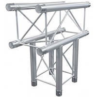 3 Way T. Strong Aluminium Truss. 35mm Tube. Complete With Two Connector SetsSquare Size: 220 x 220mm Tube Size: 35mm Weight: 3.9Kg. This 3 way Quad truss corner T uses 35mm main tubes and will add 0.5m in all directions to any truss design. The Quad Truss boasts a sleek and modern design- with four parallel chords forming a square shape that is both aesthetically pleasing and highly functional. It is the perfect choice for creating stages- display booths- and other structures for events such as concerts- trade shows- and conferences. Thanks to its lightweight construction- the Quad Truss 35mm is easy to transport and set up. It is also highly versatile- with the ability to connect to other trussing systems to create custom configurations. This trussing system is also highly durable- able to withstand heavy loads. In summary- the Quad Truss 35mm is a reliable and high-performing trussing system that is perfect for any stage event- exhibition- or other temporary or static structure requirements. Its lightweight construction- sleek design- and versatility make it a must-have for any event organizer or exhibitor looking for a top-quality trussing solution. Supplied with 8 conicals- 16 pins and 8 clips.. truss-trussing-trussing t-trussing corner-square truss