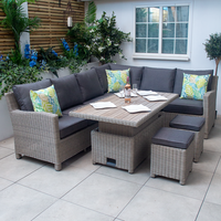 The Palma Signature Left Hand White Wash Corner Outdoor Sofa Set with Height Adjustable Aluminium Slat Top Table by Kettler is a stylish casual dining set that can be used in a number of garden settings. The outdoor corner sofa comes with comfortable weatherproof cushions with a foam core and double piping. The fantastic height adjustable slat topped aluminium high/low table is quick and simple to use. Increase the height for a more formal outdoor dining experience, or keep it low for a coffee table look. The Kettler Palma outdoor furniture collection's handwoven weatherproof wicker is wrapped in a robust aluminium frame. All products are available in two colours: White Wash or Oyster. Kettler's Casual Dining concept includes options for both outdoor dining and relaxation. Set Features Set includes left hand corner sofa and high/low aluminium slat top table Material: Aluminium square tube frame with 6mm half round wicker Weatherproof, UV resistant wicker – leave outdoors all year round (except cushions) Durable and long-lasting – built to the highest specification with extra supports along sofa Cushions included 8cm foam core seat cushions Double piped back cushions for additional support Stain resistant cushions with shower resistance – we advise taking cushions indoors when not in use Seats 8 people (approx.) 3-year warranty Colour: White Wash Set Dimensions Corner Sofa: 85cm (H) x 206.5cm (W) x 80cm (D) 3-Seater Sofa: 85cm (H) x 178cm (W) x 80cm (D) Sofa's Seat Height: 48cm Sofa's Arm Height: 64cm Stool(s): 48cm (H) x 38cm (W) x 38cm (D) Stools' Seat Height: 48cm Table: 49/69cm (H) x 145cm (W) x 81cm (D)