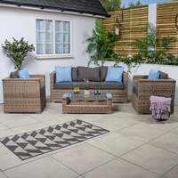 Create a stylish outdoor seating area with the stunning Bracken Outdoors Madrid Brown 3 Seat Sofa Lounge Garden Furniture Set with Coffee Table, which will look fantastic in all locations out in the garden. The 3 seater rattan outdoor sofa is perfect for relaxing with a friend after a long day and the 2x outdoor garden armchairs are super comfy for reading or relaxing. This outdoor sofa set is manufactured from powder coated aluminium frames , which are rust resistant and strong along with UV and weather resistant flat and round weave rattan . The premium grey outdoor seat and back cushions are comfortable and supportive, plus have removable covers for ease of washing. The matching small outdoor coffee table is perfect for drinks, books and magazines. Its 6mm tempered glass top looks smart and is easy to clean. Set Features Aluminium frame UV and weather resistant 6mm tempered glass top on coffee table Removable and washable cushion covers Warranty - 5 Years Fully assembled Set Dimensions Recommended Footprint: 350cm x 200cm 3-Seater Sofa: 185cm (W) x 75cm (D) x 70cm (H) Armchair(s): 75cm (W) x 75cm (D) x 70cm (H) Coffee Table: 50cm (W) x 100cm (D) x 35cm (H)
