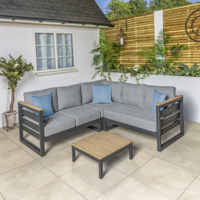 Kick back in the utmost luxury and style with a Kettler Elba Grande Signature Lounge Corner Sofa Set with Cushions and Coffee Table . One corner sofa, which fits comfortably between a left-side and right-side sofa, makes up the lounge set. This set, which can comfortably seat 5 people on soft, thickly padded cushions, would be eye-catching in any garden. The magnificent arm rests have FSC-certified Teak wood tops, which strikingly contrast the set's aluminium frame. Weatherproof and rustproof, you can leave the lounge sofa set outside all year long (except the cushions) without worrying about it breaking down or rusting. The teak-topped coffee table is the centrepiece of the set. This is supported by a sturdy, weatherproof, and rust-resistant aluminium frame. Real teak was used to make the table top, which has been aged to enhance the table's appearance. The back and seat cushions feature a 5cm foam core that provide comfort but ensures the cushions keep their shape after every use. The seat cushions sit on a textile sling to help add extra comfort when sitting down for long or short periods. Set Features Includes: 1x corner sofa, 1x right-side sofa and 1x left-side sofa with cushions and 1x coffee table Aluminium frame with textile sling seating and thick Polyester seat and back cushions 5cm foam core cushions Weatherproof Seats up to 5 people Dimensions Left & Right Sofa: 68cm (H) x 136cm (W) x 85cm (D) Corner Section: 68cm (H) x 85cm (W) x 85cm (D) Coffee Table: 30cm (H) x 74cm (W) x 74cm (D)