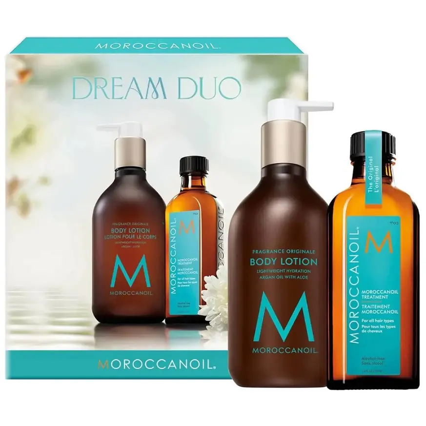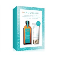 Moroccanoil Treatment 125ml + Moroccanoil Hand Cream 75ml\nThe famous, Moroccanoil treatment for all hair types. Create an instant shine with long-term conditioning.\nMoroccanoil has a unique quality of instant absorption into hair, creating an instant shine and long term conditioning without leaving a residue.\nBenefits include:\n* Ultra-Light Formula\n\n* Restores Shine\n\n* Strengthens and Conditions\n\n* Reduces Drying Time\n\n* Alcohol-Free\nPump dispenser included.\nMoroccanoil Body Hand Cream\nMoroccanoil Body Hand Cream Fragrance Originale is a luxurious and concentrated hand moisturizer created with nutrient-rich argan oil and avocado oil as well as cocoa, shea and mango butter to moisturize and help repair dry hands. The weightless hand cream absorbs into the skin quickly to leave them soft and supple. Delicately fragranced with the signature Moroccanoil scent. Paraben-free.\n \n \n