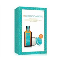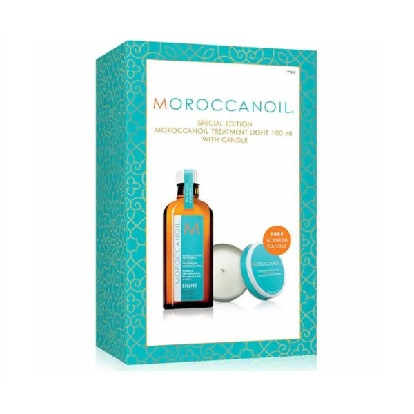 Moroccanoil Treatment Original 100ml Free Candle includes a replenishing hair oil and a scented candle with the brand’s signature fragrance. Achieve smooth, healthy-looking locks and create a relaxing ambience during the festive season.\nMoroccanoil Treatment Original 100ml Set Contains:\nOriginal Treatment (100ml)\nA luxurious formula that works to renew and repair dry, damaged hair. Harnessing the powers of antioxidant-rich Argan Oil and shine-enhancing vitamins, the nourishing formula helps to strengthen and fortify strands, whilst fighting frizz and effectively detangling for a salon-worthy finish. Expect calm, manageable locks with revived radiance and vitality.\nScented Candle\nInfuse a relaxing fragrance into your abode. Crafted in France from premium European wax and a natural cotton wick, the scented candle releases Moroccanoil’s signature aroma to create a warming, soothing atmosphere in any room. Housed in a branded tin. Approximate burn time of 6.5 hours.\n