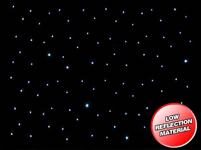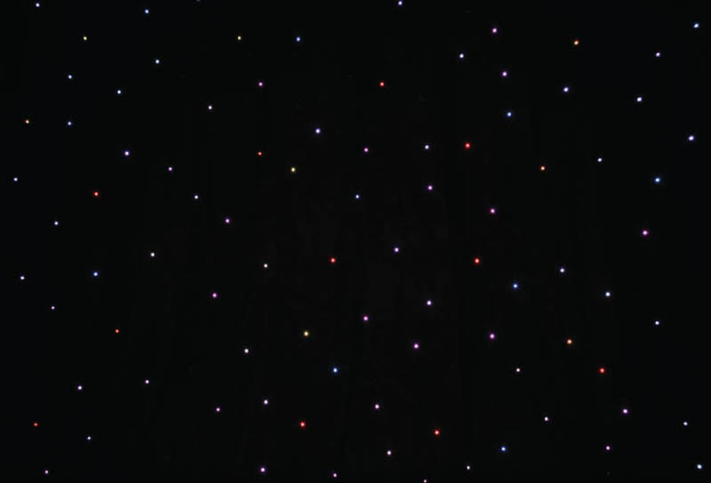 Size Indicated is Width x Height. Black Molton Cloth. White LEDs. Controller Included. Selectable DMX Channels. Auto- Sound and Master/Slave Modes. Hook & Loop Eyelets. 2 Sizes AvailablePower Supply: 100-240Vac- 50/60Hz Power Consumption: 100W LED: 144 x White (6 x 3m) or 192 (6 x 4m) DMX Channels: 5 or 12 Controller Dimensions: 180 x 50 x 150mm Controller Weight: 1.2Kg Fabric Weight: 12.5Kg (6 x 3m) or 14.5Kg (6 x 4m). The Star Dream is a black molton cloth with built-in LEDs (8 groups) and LED controller to create a starry sky. It is available in different sizes with white LEDs. The backdrop curtain is equipped with hook and loop and eyelets. The Star Dream has several operating modes such as Auto- Sound and Master/Slave. Control via DMX is also no problem with 3 pin XLR inputs & outputs. Available in 6 x 3m or 6 x 4m.. led star cloth-star cloth-star curtain