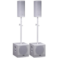 Active PA System. 2 x 6.5" Tops & 2 x 12" Subs. Telescopic Poles & Covers Included. Available in Black or WhitePower: 3200W. The VN2000 is built around four boxes: a pair of Ventis 206As and a pair of Subline 112SAs- bundled together with a pair of variable-height connecting poles. This makes for a powerful full-range mobile PA system that also offers the added flexibility to be broken down into smaller setups if that's what a particular event or situation requires. Ventis 206A The Ventis 206A is an extraordinary active speaker featuring a pair of 6.5 low frequency woofers and a 1 B&C high frequency compression driver arranged in a vertical configuration. Its a great sounding- solid box made out of 15mm birch ply finished in a scratch-resistant paint and features a full-face grille. At just 12kg- its incredibly easy to move around using the integrated handle on the back. It also features a number of M10 suspension points- so its perfect for permanent installation- as well as a 35mm top-hat underneath for mounting on the included sub pole or a standalone tripod. Around the back you'll find the amp module that almost spans the entire width of the cabinet and offers 700W RMS of low frequency amplification and 200W RMS of high frequency. As with the rest of the Ventis range- the LF is Class D while the HF is Class H/AB. Power is delivered by a powerCON TRUE1 connector and an AC loop out is also included so you can daisy-chain the power for another cabinet. Input-wise- the Ventis 206A offers a single XLR / ¬-inch jack combi socket that can accept both a LINE or MIC level signal and a pair of RCA phono connections to allow- for example- an external MP3 player to be directly connected. Both inputs have a dedicated level control- which means that a mic and background music source can be connected and mixed without the need for a separate mixer. An XLR output socket is also provided to allow the audio signal to loop out to another cabinet. The built-in DSP accessed via a large backlit LCD display and corresponding turn-and-push control dial allows you to fine-tune the sound to your own liking. It also allows you to dial-in a delay (0-10 metres)- which is very useful for conference work- as well as a Hi-Pass filter. This means that you can either run the box full-range- so its useful as a discreet cabinet for wedding ceremonies or speeches- or allow it to concentrate all of its power on the hi/mid frequencies when you have the sub connected. SUBline 112SA The Subline 112SA active cabinet has been called "a work of genius" in reviews (ProMobile) The band-pass design of its predecessor- the 12SA- has been updated to a more traditional bass-reflex configuration- resulting in a smaller and lighter cabinet. Some would argue that a front-firing box like this really needs to be a lot bigger- with chunky drivers- in order to get really low- but that's certainly not the case with the amazing 112SA. The 112SA is built around a 12 woofer with a 2.5 coil- offering a huge amount of punch and high SPL from an incredibly compact design. The amp module offers 700W RMS and has a built-in DSP with eight different pre-sets. You also get an 8-step delay control and a Phase push button. Two XLR input sockets (a stereo pair) are provided alongside corresponding outputs and a push button to activate or bypass the variable High Pass filter. This means that- for smaller gigs- you can run the VN2000 as a 3-box system with your mixer connected to a single sub feeding the two top boxes in stereo. Looks wise- the sub matches the 206A perfectly- with its birch-ply cabinet finished in the same scratch-resistant paint and full-face grille. Two ergonomic handles on the side make it easy to lift and- at just 23kg- it really IS an easy lift! The VN2000 is perfect for- conference work- ceremonies- speeches and events from 0 to 200 people this makes it a perfect mobile DJ system.. pa system-active pa system