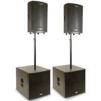 Active PA System. FBT PromaxX 114A Tops & Subline 118SA Subs. 2 x 14" Tops & 2 x 18" Subs. Telescopic Poles & Covers Included. Black FinishPower: 4200W. Introducing the ProMaxX PM 4000 Active Sound System. This system combines the finesse of two ProMaxX 114A active tops and 118SA active subs- delivering a total of 4200 Watts RMS. The ProMaxX 114A- with its specially crafted polypropylene cabinet and stylish grille design is powered by a purpose-built FBT amplifier module- this system ensures the highest audio performance. What sets the ProMaxX PM 4000 apart is its powerful digital signal processing (DSP) platform- easily accessible through an intuitive graphical user interface. With six carefully designed equalizer presets- including options for vocals- DJing- touring- and more- you have the perfect sound for every occasion. You can also create and save your own presets with up to five parametric equalizers per slot- fine-tuning your sound to perfection. Additional features such as a high-pass filter- mic/line selector- tone settings- and optional delay up to 10 meters give you full control over your audio environment. Plus- you can choose between two limiter modes- MAX-SPL or MAX-QUALITY- to suit your performance needs. You can pole-mount- wall-hang- suspend- or deploy it in an array- adapting to your unique setup requirements. Complementing the ProMaxX 114A are the Subline 118SA active subs. These bass-reflex subs- constructed from birch plywood- extend the low-frequency response to match various FBT speaker systems. They're driven by Class D amplifiers and equipped with a Digital Signal Processor with presets designed to seamlessly integrate with other FBT speakers. For convenience- the Subline 118SA features IN/OUT stereo connectors- allowing you to use just one subwoofer with left and right speakers. The Neutrik TRUE1 Power connection eliminates the need for a power switch while ensuring a secure and reliable connection. With optional wheels- ergonomic integrated carrying handles- and tour-grade plywood cabinets- transporting these subs is a breeze.. pa system-active pa system