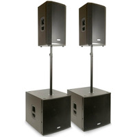 Active PA System. FBT Ventis 112A Tops & Subline 118SA Subs. 2 x 10" Tops & 2 x 15" Subs. Telescopic Poles & Covers Included. Black FinishPower: 4200W. The VN 4000 is a powerful and versatile PA system designed for various applications- including conference work- ceremonies- speeches- DJ sets- and live music events. It consists of the following components: 1. Ventis 112A Top Boxes: These are active speakers with a 12" low-frequency woofer and a 1" B&C high-frequency compression driver in a vertical configuration. The cabinets are made of 15mm birch ply with a scratch-resistant paint finish and feature a full-face grille. They are lightweight at 20.6kg- making them easy to transport with an integrated handle. M10 suspension points make them suitable for permanent installation- and there's a 35mm top-hat for mounting on sub poles or tripods. The amplifier module provides 700W RMS for low-frequency and 200W RMS for high-frequency- with Class D for LF and Class H/AB for HF. Input options include a single XLR/¬-inch jack combi socket that accepts both LINE or MIC level signals and a pair of RCA phono connections. There are dedicated level controls for each input- allowing you to mix a microphone and background music without a separate mixer. An XLR output socket is provided for daisy-chaining audio to another cabinet. Built-in DSP with an LCD display and control dial allows for sound tuning- delay adjustments (0-10 meters)- and a Hi-Pass filter for focusing on hi/mid frequencies when using a subwoofer. 2. SUBline 118SA Subs: These are subwoofers with an 18" woofer featuring a 3-inch voice coil- delivering high SPL (137 dB) in a compact design. The amplifier module provides 1200W RMS and includes a built-in DSP with eight different presets- an 8-step delay control- and a Phase push button. Two XLR input sockets are provided for stereo input- along with corresponding outputs and a push button for a variable High Pass filter. The sub matches the Ventis 112A in terms of design- with a birch-ply cabinet- scratch-resistant paint finish- and full-face grille. Ergonomic handles on the side make it easy to transport- despite its powerful performance. Package Accessories: The VN 4000 package includes two telescopic poles for mounting the top boxes- a carry bag for the poles- and covers for both the top speakers and subs. The VN 4000 system offers flexibility and scalability- allowing it to be used as a full-range mobile PA system or broken down into smaller setups as needed. It's well-suited for a wide range of applications and provides powerful sound reinforcement with quality components and features.. pa system-active pa system